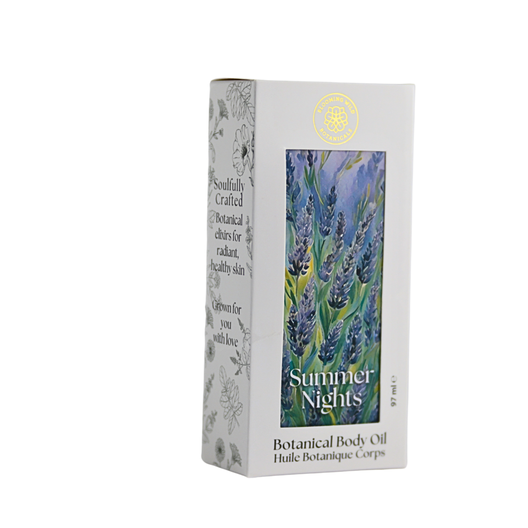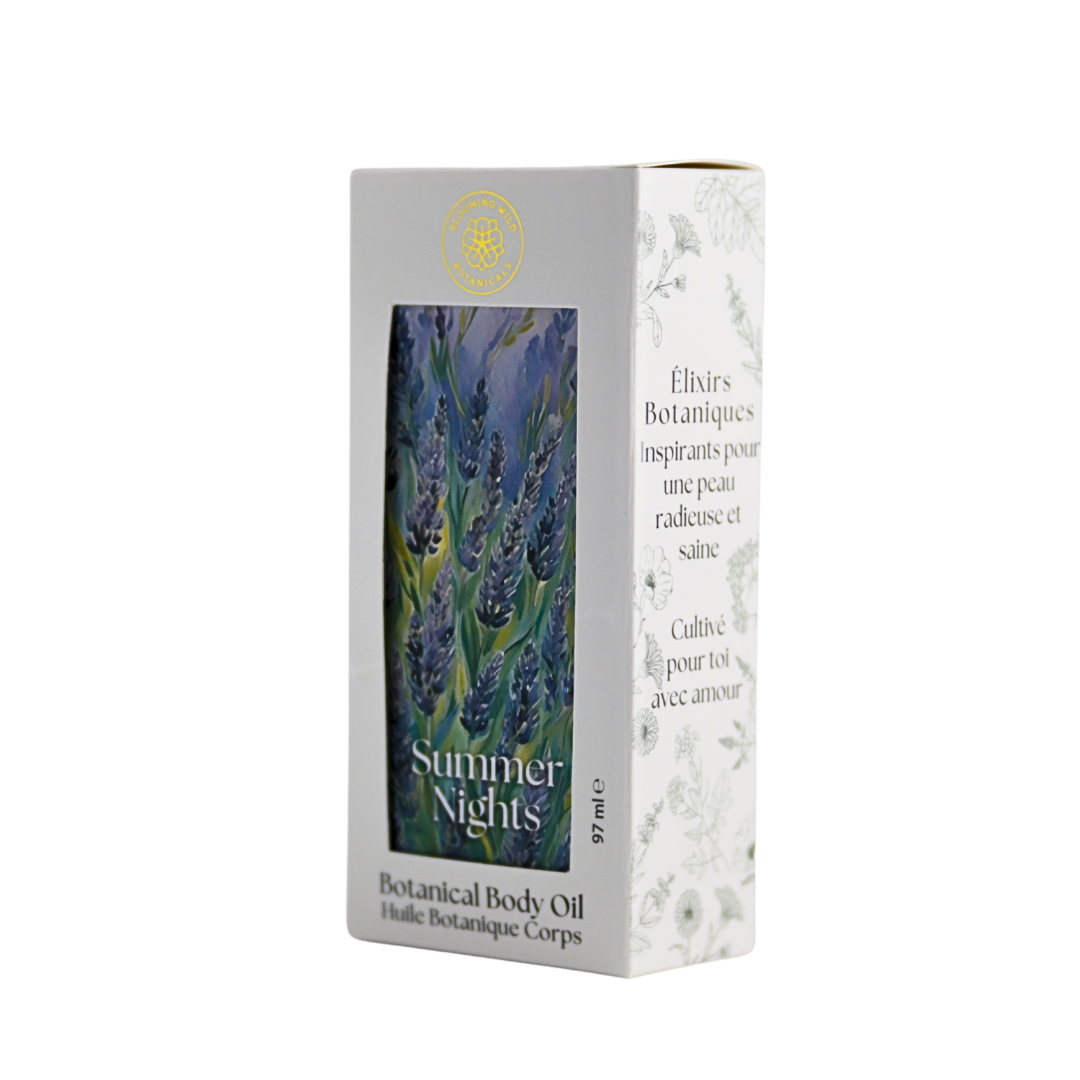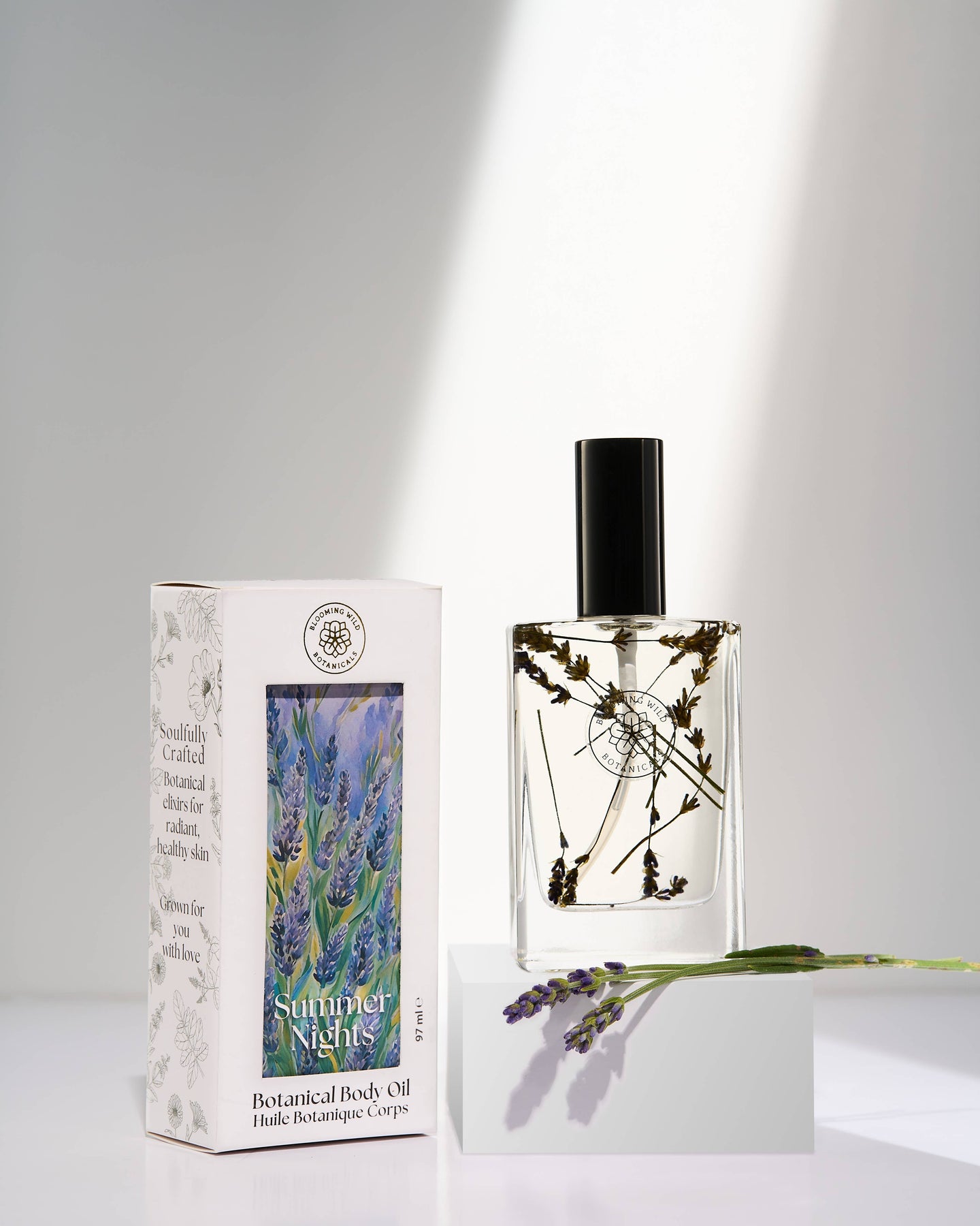 Bask beneath the moon's gentle glow and surrender to the captivating charm of Summer Night's Body Oil—a sublime soothing evening ritual oil. Our Summer Night's Body Oil is a blend the purest extracts of lavender, with a luxurious blend of premium-quality lavender essential oils and precious seed oils. Delicate, light weight, and deeply nourishing, it rejuvenates the skin, infusing it with vital vitamins, minerals, and antioxidants, leaving behind a velvety smoothness. Presented in a heavy glass 100 ml bottle with a premium treatment pump, Meadow exudes luxury from every detail.