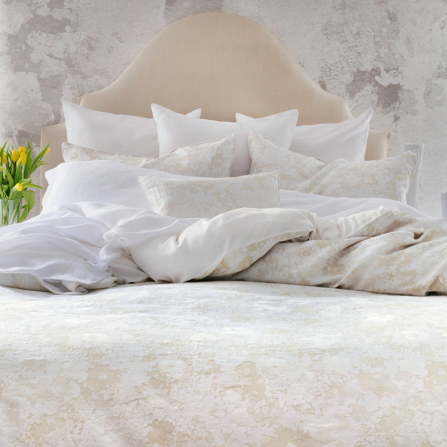 Beautifully blended mixture of soft white and cream form this contemporary floral patterned jacquard from Italy. With Giza long staple cotton and Linen the fabric falls gently over the bed.