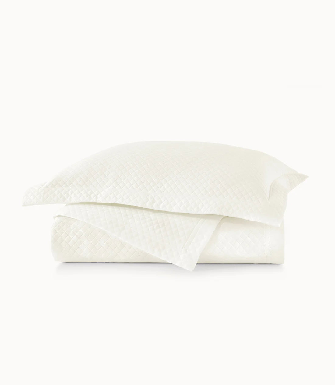 This uniquely quilted coverlet made in Portugal from cotton sateen fabric,  brings a stately elegance and interest into the bedroom with its pebble like quilting.  Weather alone or mixed with our Vesper cream duvet cover and shams this is a stunning bed covering.